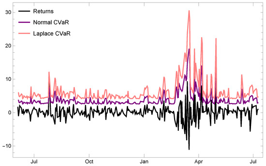 We end this subsection by comparing the normal CVaR and Laplace CVaR for risk management under the GARCH process and the given experiment features. The computational evidence in this case is portrayed in Figure 8, which again manifests that CVaR under the Laplace distribution is a good choice for risk management because it owns fatter tails, and thus more reliable values for risk can be provided for trading in investment strategies.