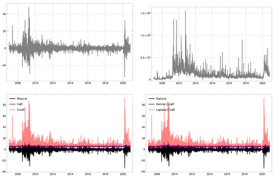 Computational evidence of the “NYSE:MGM” with . (Top left) the fractional change over the time. (Top right) Its volume over the time. (Bottom left) Laplace VaR and CVaR comparisons. (Bottom right) Laplace and Normal CVaR comparisons. The horizontal axis stand for the time of evaluation.