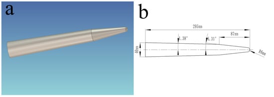 The first step of Figure 1 is aerodynamic heating data acquisition via the finite element calculation in ANSYS Workbench 2020 R2. In Figure 2, there is a three-dimensional drawing and a two-dimensional drawing of the hypersonic flying object. A hypersonic flying object is selected as the calculated object, and its specific parameters are: total length 295 mm, flying object warhead length 87 mm, flying object warhead radius 6 mm, flying object body diameter 40 mm, angle of the flying object warhead 6.31°, angle of the flying object body 1.38°, as shown in Figure 2b.