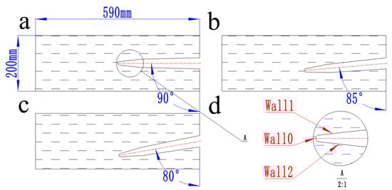Based on the two-dimensional drawing of the hypersonic flying object, the range of the outflow field of the hypersonic flying object is 590 mm by 200 mm, in which 590 mm is 2 times length in horizontal direction and 200 mm is 5 times in longitudinal direction. In Figure 3, three different attack angles are set: 0°, 5°, and 10° and from a partially enlarged drawing of the hypersonic flying object’s warhead (Figure 3d), three different parts of the hypersonic flying object’s warhead are chosen as calculated objects: Wall 0, Wall 1, and Wall 2 because these three parts represent the whole of the hypersonic flying object’s warhead and are the maximum temperature values.