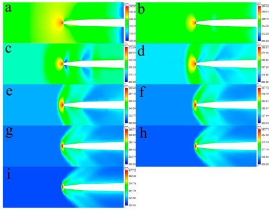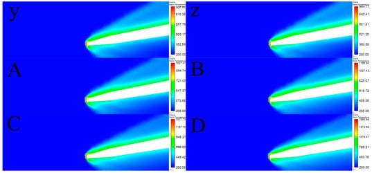 According to the contours of all groups (a–D) in Figure 4, Figure 5 and Figure 6, the finite element calculation results of three chosen calculated objects (Wall 0, Wall 1, Wall 2) from the hypersonic flying object’s warhead are plotted to scatter graphs in Figure 8, Figure 9 and Figure 10. Figure 8a–c is connected to the relationship of Wall 0 between position and temperature; Figure 9a–c is connected to that of Wall 1; Figure 10a–c is connected to that of Wall 2. As a result, temperature values are positively associated with the flight Mach number.