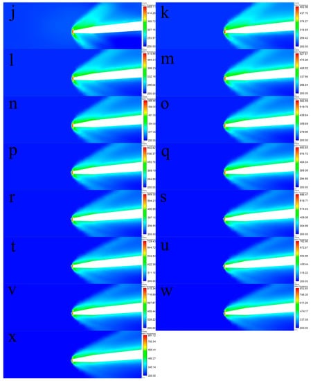 In Table 1 is a flight trajectory of the hypersonic flying object from flight altitude (H m) 31,272 m, flight Mach number 0.61136 to flight altitude 13,577 m, and flight Mach number 5.015958. The flight trajectory of the hypersonic flying object is a continuous flight course and that is divided into 30 Groups a–D of Table 1 with the same interval, which are different flight positions and represent the whole flight trajectory for the finite element calculation. The flight trajectories of the hypersonic flying object from Groups a–i are set with attack angle 0°; those from Groups j–x are set with attack angle 5°; those from Groups y–D are set with attack angle 10°. Based on the ATMOSCOESA (H) formula [] and flight altitude data, the corresponding atmospheric environment values are obtained in MATLAB, including ambient temperature (T K), ambient sound velocity (a m/s), ambient pressure (P Pa), ambient density (R kg/m3). Some details about the ATMOSCOESA (H) formula are explained: SCOESA represents the U.S. Committee on Extension to the Standard Atmosphere, and the ATMOSCOESA (H) formula is a built-in MATLAB formula used for checking 1976 U.S. Standard Atmosphere. For example, if the flight altitude value of a hypersonic flying object is input into MATLAB, the corresponding atmospheric environment values (T, a, P, R) are obtained via the ATMOSCOESA (H) formula.