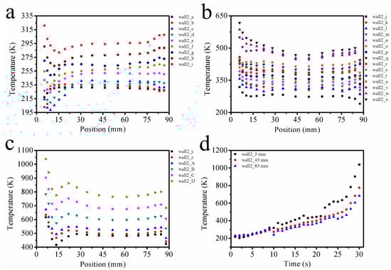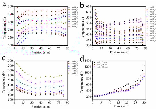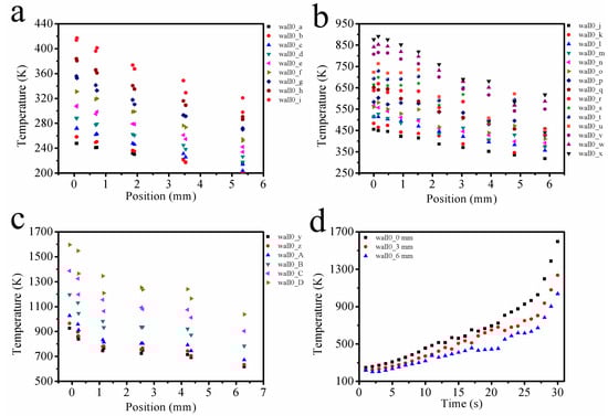 (a–c) The scatter graphs of Wall 0 between positions and temperature values and (d) the fitting curves.