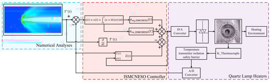 To solve the abovementioned problems, some control strategies, which are fuzzy control [], proportional-integral-derivative (PID) control [], and iterative learning control (ILC) [] were developed for TSTQL. In [], a fuzzy control is used for transient aerodynamic heating simulation, which is produced by the surface of a hypersonic flying object, in a quartz lamp heating device. In [], a nonlinear PID, along with digital and analog values, are applied for aerodynamic heating tracking of quartz lamp heaters. In [], a fractional order PDα ILC is designed for quartz lamp infrared radiation aerodynamic heating simulation experiment. However, fuzzy control is mostly based on empirical formulae with many parameters for tuning, leading to an imbalance between high precision and efficient decision-making; the PID control just relies on tracking errors linear superposition, which poses a threat to rapidity and overshoot. ILC with some prepared calculations cannot track temperature trajectories in real time during its open loop control.