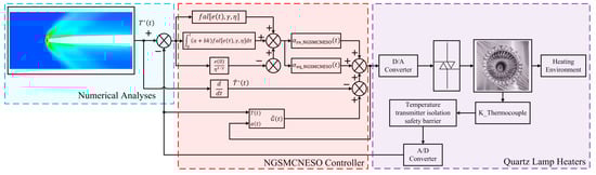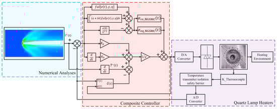 Step 2 (control system): the control system is made of five parts: temperature trajectory, control center, power regulator, quartz lamp heaters, and temperature sensor. The temperature trajectories are from the finite element calculation results, called transient aerodynamic heating. In the control center, our proposed controllers are loaded to calculate. The transistor, as a power regular, is a type of silicon-controlled rectifier (SCR), and it can obtain different power values via changing the SCR conduction angle in the AC voltage regulating circuit. Therefore, the quartz lamp heaters have a variety of heat radiation abilities, providing an adaptive heating environment for test samples. Next, in the temperature sensor module, the K_Thermocouple collects real temperature signals of quartz lamp heaters and transmits these temperature signals to the temperature transmitter isolation safety barrier. Finally, reference temperature trajectories and real temperature signals are fed back in the control center.