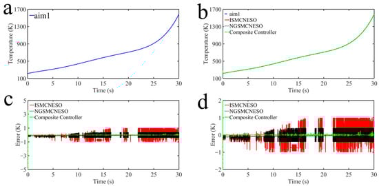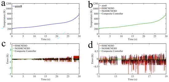 Simulation results: (a) the fitting curve of the reference temperature trajectory from Wall 1_85 mm; (b) the reference temperature tracking performance among ISMCNESO controller, NGSMCNESO controller, composite controller; (c) the tracking errors; (d) their partial enlarged figures in details.