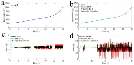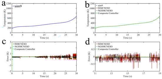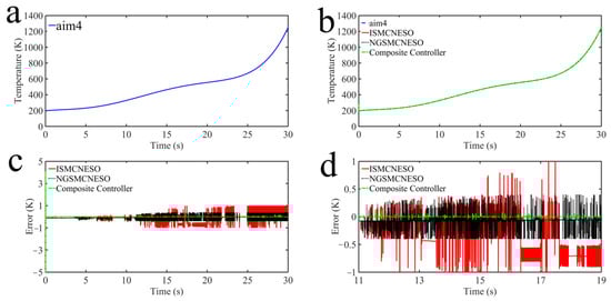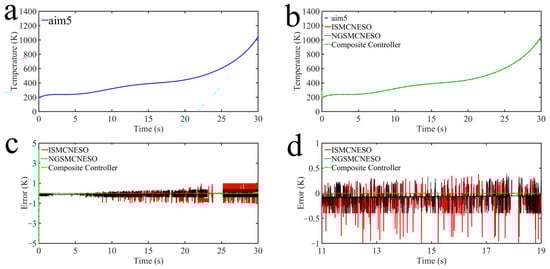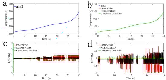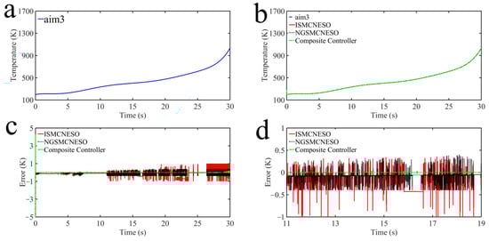 Simulation results: (a) the fitting curve of the reference temperature trajectory from Wall 0_3 mm; (b) the reference temperature tracking performance among ISMCNESO controller, NGSMCNESO controller, composite controller; (c) the tracking errors; (d) their partial enlarged figures in details.
