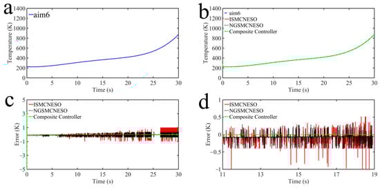 Simulation results: (a) the fitting curve of the reference temperature trajectory from Wall 0_6 mm; (b) the reference temperature tracking performance among ISMCNESO controller, NGSMCNESO controller, composite controller; (c) the tracking errors; (d) their partial enlarged figures in details.