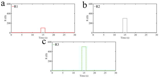 Simulation results with some external disturbances: (a) a step signal disturbance of R1; (b) a step signal disturbance of R2; (c) a step signal disturbance of R3.