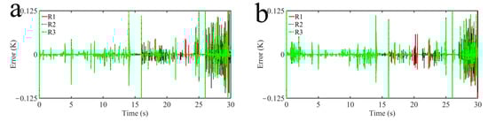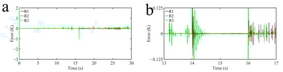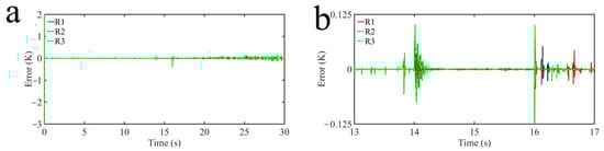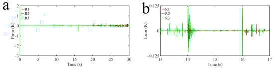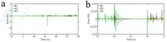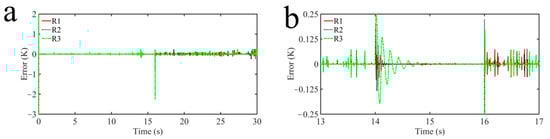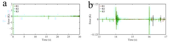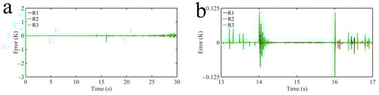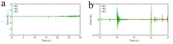 To study the robustness of the composite controller, the time-varying resistance is chosen as a kind of external disturbance: R1, R2, R3. As is shown in Figure 23, the value of R1 is set as a step signal which is 100 Ω from 14 s to 16 s and 3.08 Ω in the other time. The values of R1 and R2 are also set as a step signal with 300 Ω and 500 Ω, respectively, and that of the other time is 3.08 Ω. From Figure 24, Figure 25, Figure 26, Figure 27, Figure 28, Figure 29, Figure 30, Figure 31 and Figure 32, the larger the value of the step signal is, the lager the amplitude of chattering will be. For example, the overshoot of R3 for the composite controller is 0.25 K in Figure 24b and the system state reaches the steady state after 1 s. At 16 s, the value of R3 is from 500 Ω to 3.08 Ω, and the overshoot of R3 for the composite controller is about 2.5 K in Figure 24a. Although the external disturbances have two sudden changes which have an adverse impact on tracking performance, the composite controller shows a strong robustness. Considering the effect of some measurement noises, the external signal is set as a step signal which is 100 Ω from 4 s to 5 s and from 25 s to 26 s on the basis of external disturbances before (R1, R2, R3). The tracking errors of Wall 2_45 mm and Wall 2_85 mm for the composite controller are shown in Figure 33. At the beginning of 4 s and 25 s, the tracking error trend has a slight chattering and converges to zero quickly. Hence, the composite controller is insensitive to measurement noises.