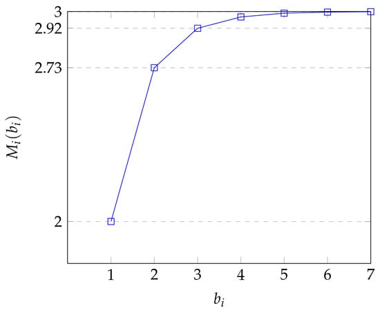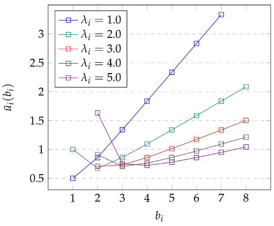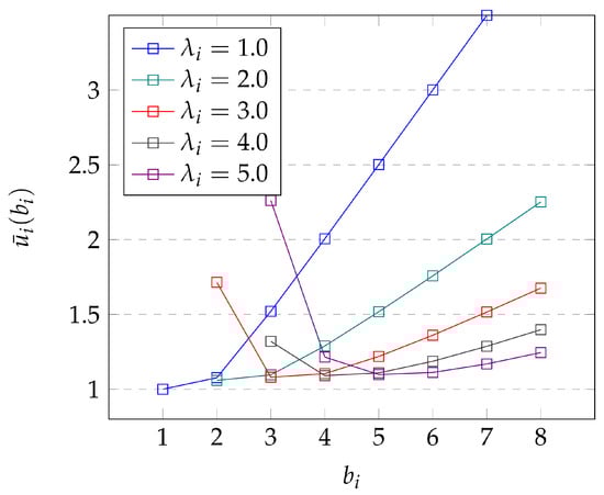 Both figures show that the function has one minimum for a specific value of depending on the system’s parameters. For instance, if , then the optimal batch size is one for both values of , whereas for the optimal is already equal to two; and for higher input rates it depends on (compare the graphs for in Figure 4 and Figure 5).