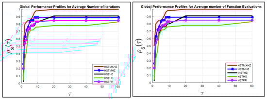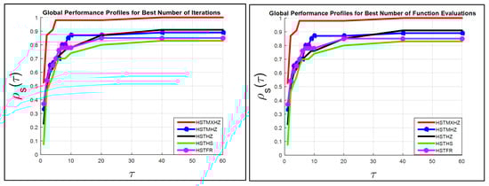 Therefore, regarding the worst number of iterations criterion, the shows us that all test problems are solved by HSTMXHZ, while , , , and of the test problems are solved by HSTMHZ, HSTHZ, HSTHZ, HSTHS, and HSTFR algorithms, respectively.