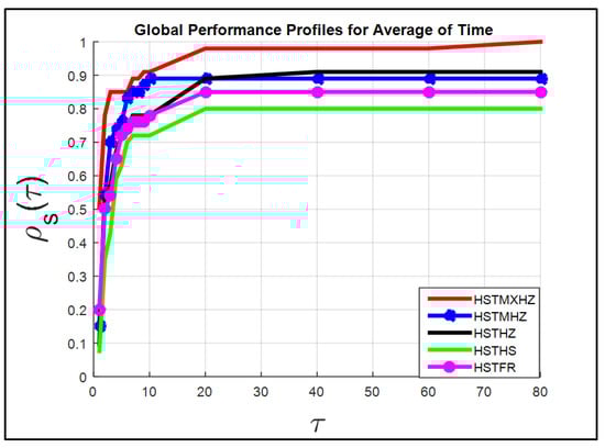 Note: The maximum value of the parameter in the X-axis is in all figures except Figure 3, because it is shown that our proposed algorithm HSTMXHZ is not capable of solving all test problems at ; thus, we increase the value of the parameter to . Hence, shows that the HSTMXHZ algorithm solves all test problems regarding the average CPU time criterion.