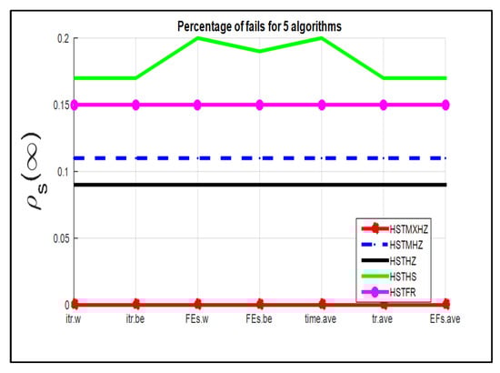 At , we obtain the following results: algorithm HSTMXHZ does not fail to solve any of the test problems for the set criteria Fit. Algorithm HSTMHZ fails to solve 11% of the test problems according to the set criteria Fit. Algorithm HSTHZ fails to solve 9% of the test problems according to the set criteria Fit. Algorithm HSTHS fails to solve 17–20% of the test problems according to the set criteria Fit. Algorithm HSTFR fails to solve 15% of the test problems according to the set criteria Fit.