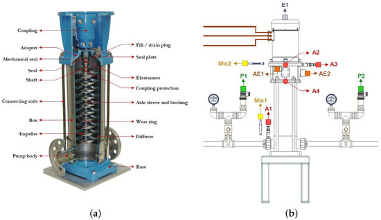 In this research, a multi-stage vertical CP is considered. The CP model 3SV10GE4F20 was a 2 HP pump operated at 3500 rpm. The pump had ten stages for a nominal flow of 15 GPM. The vibration signals were recorded using model 603C01 accelerometers. The module NI 9234 connected to a laptop computer was used to acquire the vibration signal using a sampling frequency of 50 kHz. The physical description and locations of sensors are shown in Figure 1. The signal acquisition was performed under controlled operating conditions concerning the room temperature, relative humidity, and environmental noise.