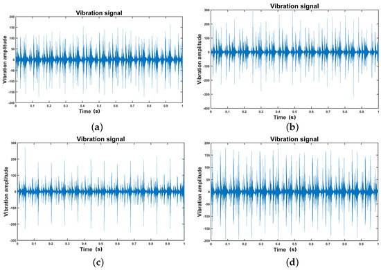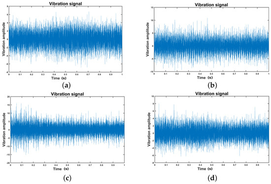The set of fault conditions for the CP included several severity levels in the impeller (see Table 1). Examples of the vibration signals for the CP dataset are shown in Figure 3. Four conditions are shown, and in this subset, only subtle differences in signal amplitude can be visually detected. Any fault signature could be affected by noise.