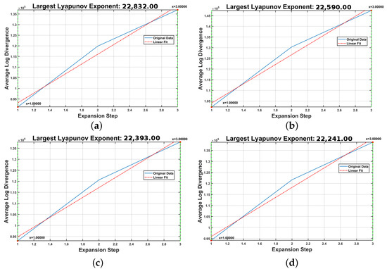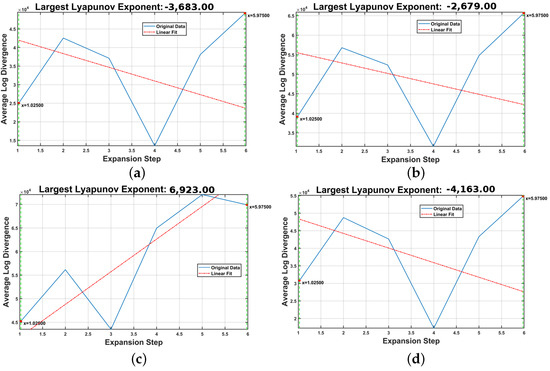 The Lyapunov exponent quantifies the relative motion of trajectories in the phase-space of a system [64]. Its value allows for determining if a signal is chaotic or periodic. A system can be represented by several Lyapunov exponents determined by the embedded dimension. However, the largest one, denoted , is typically used. There are several algorithms for calculating the Lyapunov exponent [65]. The method proposed by Rosenstein et al. [66] was implemented in this research.