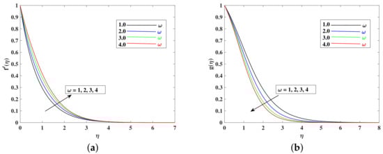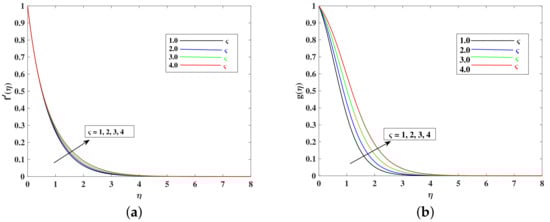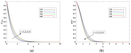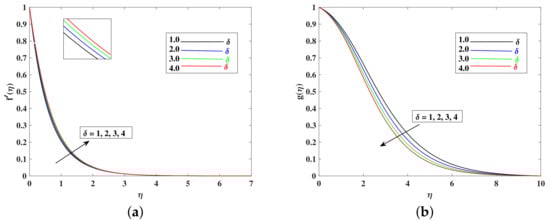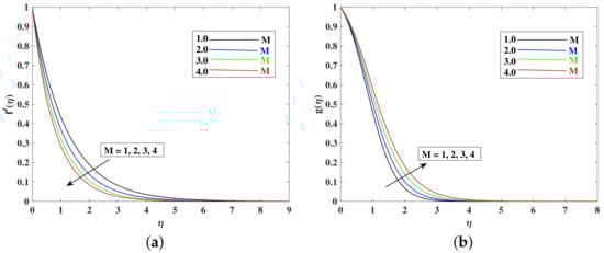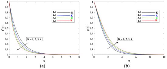 - The fluid’s velocity increases with larger values of the , , , and and it decrease with enhancements in M, K, , and because these parameters are responsible for decelerating the flow.