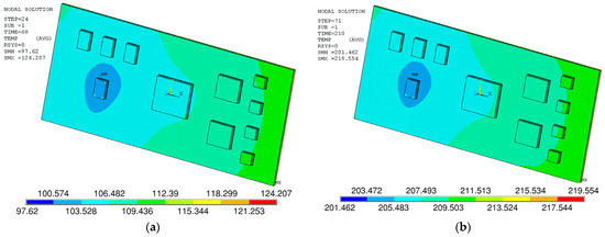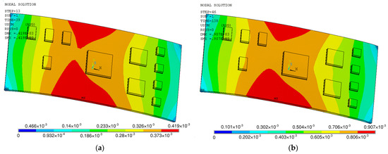 The warpage on the PCB assembly during the reflow soldering is studied based on the temperature field simulation, as shown in Figure 4. From Figure 4a, the amount of warpage grows from 0 mm to 0.419 mm when the PCB assembly passes through the preheating zone. Since the temperature rises rapidly in the preheating zone and the thermal conductivity of each component is different, a large temperature difference appears at each position of the PCB assembly, thereby causing the deformation. When the PCB assembly passes through the soaking zone, the amount of warpage increases from 0.419 mm to 0.91 mm. During this period, although the differences in the material properties of each component increase further, the warpage rate is reduced due to a sufficiently long soaking time, the low heating rate and the relatively uniform temperature distribution, as shown in Figure 4b. When the PCB assembly enters the reflow zone, the difference of the material properties (especially the CTE) among the components rises to the maximum as the temperature reaches its peak value, thereby resulting in the highest amount of warpage at 1.32 mm, as shown in Figure 4c. Finally, the PCB assembly enters the cooling zone. Due to the rapid temperature drop in this zone, the difference in the material properties of each component gradually decreases, and the amount of warpage also decreases from its maximum value to 0.964 mm, as shown in Figure 4d.