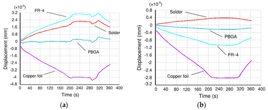 Figure 5 shows the displacement of the components (FR-4, copper foil, solder and PBGA) on the PCB assembly over time. From Figure 5, the PCB assembly has a certain displacement in the X, Y, and Z directions during the reflow soldering process. Meanwhile, the displacement in the Z direction is much greater than the other two directions. On this basis, it can be considered that the displacement in the Z direction is the main cause of warpage.