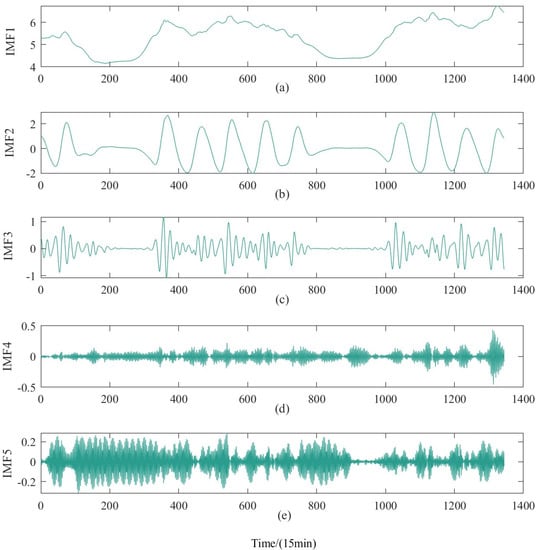 Decomposition results of building power consumption data with VMD. (a) IMF1, (b) IMF2, (c) IMF3, (d) IMF4, (e) IMF5.