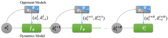 During the execution phase, the agents work in a distributed fashion. When performing a given task at time step t, agent i obtains its corresponding observation . First, the observation will be input into the actor module and the world model. The agent policy along with opponent models produces imagined joint actions that makes one step rollout. It is noteworthy that the opponent models are a mapping as Equation (4):