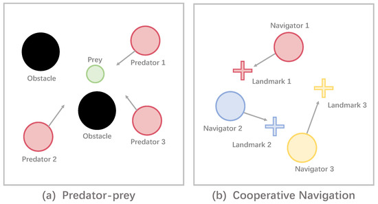 We select the Multiagent Particle Environments (MPE) as the benchmark suite for our experiments. The MPE experimental scenarios first appeared in the work of [39] to specify cooperative and competitive tasks among multiple particles. There are continuous state spaces in these scenarios, where both continuous or discrete actions are allowed. An agent in the environment obtains partial observations, including its absolute velocity, relative position, and relative velocity to other entities. In this article, we test the competing algorithms in two typical scenarios in MPE, as described below.