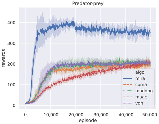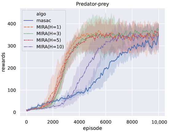 The rollout length H of the MIRA algorithm is fixed to 5 and the prey adopts a policy of random actions in the predator-prey scenario. Figure 4 shows the episode reward curves of all the five methods when training on the predator-prey scenario, where the y-axis represents the accumulated rewards for all agents in an episode. The plot is smoothed using a one-dimensional Gaussian filter with , where the bold lines and the corresponding shaded areas represent the mean values and upper-lower bounds of the episode rewards over the five repeated but independent runs, respectively. After training episodes, all algorithms reached their policy convergence. Figure 4 shows that the curves of COMA, MADDPG, and VDN are similar, and the episode reward of MAAC increases more slowly than other competitors. MIRA improves much faster than the others and stabilizes at a considerably higher value.