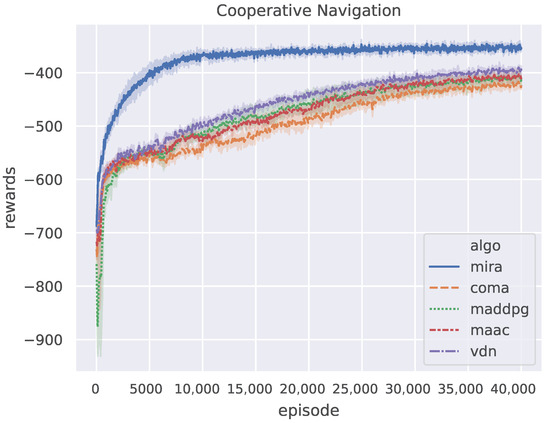 Figure 5 shows the results of the five algorithms on the Cooperative Navigation scenario, where the curves are smoothed using a one-dimensional Gaussian filter with . All algorithms are trained for episodes. It can be seen that the curve of MIRA has a sharp trend of convergence. The reward obtained by MIRA remains stable at a much higher level only after episodes, whereas other algorithms tend to converge after episodes. As shown in Table 3, MIRA has 2.8–3 times faster convergence speed and 10–16% better asymptotic performance than other algorithms. It is shown that MIRA is not only competent for multi-agent competitive tasks but also has comparable performance to other algorithms in multi-agent cooperative tasks. Although model-free CTDE methods can also learn to cooperate well tardily, MIRA can improve their learning speed and performance by increased exploration via a latent variable.