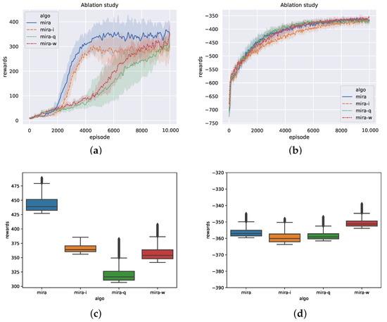 In Figure 6c,d, we sample the episode rewards of the four methods after convergence and plot the distribution of evaluation results in the boxplot. From Figure 6c, it can be seen that the episode reward distributions of MIRA-w and MIRA-q are scattered and have much more outliers. The episode rewards of MIRA are higher than the other three, and the policy performance is more stable.