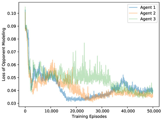 The loss function of opponent models consists of two terms: (1) A Kullbach–Leibler divergence between the ground-truth action of the observed agent and the output of opponents models. (2) An entropy of is used to increase the diversity of the opponent policy. Specifically, the loss function is written as