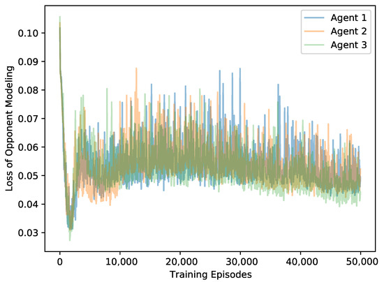 To analyze the accuracy of the world model, we treat the convergence of the loss function as the metric for evaluating the training performance. In our examples, the MIRA algorithm is set with and we test the loss value of the opponent models in the predator-prey and Cooperative Navigation scenarios, respectively. The training curve of predator-prey scenario is shown in Figure 7. The results show that after short-term training, the model loss can be stably converged, and the opponent model can quickly learn the task that predicts the actions of corresponding agent. Figure 8 shows the model loss training curve in the Cooperative Navigation scenario. It can be seen that the loss values of the three agents roughly coincide and converge approximately, which indicates the realization of the prediction task. However, all these models suffer from inevitable errors due to the limited approximation ability of deep neural networks for policies function and the continuous changes of learning targets i.e., the real opponent policies.