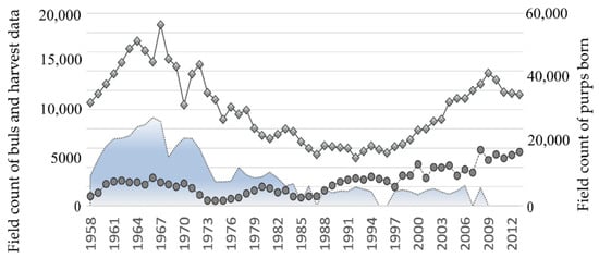 Following years of sealing, and despite all efforts to optimize it, the Tyuleniy Island herd started to reduce, e.g., [17,18]. By the late 1980s, the number of births decreased by half compared to the average values of the 1960s and early 1970s and then fixed there. Other North Pacific fur seal populations also demonstrated reduced population numbers, particularly Commander and Pribilof Islands [2,9,19], etc. To change this undesirable trend, hunting on Tyuleniy Island was considerably limited by the 1990s, and completely canceled in 2008. Figure 1 demonstrates the field counts available for the Tyuleniy Island herd of northern fur seals. As expected, the number of adult males in the population dramatically increased (Figure 1, the line with bullets), but the expected rise in the number of births did not follow: although the number of newborn pups is higher, the level of the mid-1960s remained unachieved (Figure 1, the line with the diamond shapes).