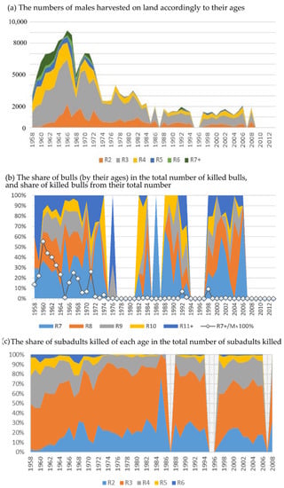Structure of harvest. (a) The numbers of males harvested on land accordingly to their ages (R2–R6), bulls are included in the group of seven-year-olds and older (R7+). (b) The share of bulls (by their ages) in the total number of killed bulls, as well as that of killed bulls from their total number (the line with markers, R7 + (n)/M(n)). (c) The share of subadults killed of each age in the total number of subadults killed.