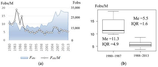 (a) Average number of pups per bull (P(n)/M(n − 1), or average reproductive efficiency, on the left axis, and the number of bulls at the rookery (M(n − 1)), on the right axis. (b) Box plots of average reproductive efficiency corresponding to the periods: 1959–1973, 1974–1978, 1979–1988, and 1989–2013.
