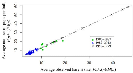 The Granger causality test [31] confirms (p << 0.001) the presence of causal relationship between the considered time series with a lag of 1, where the observed average harem size is Granger-cause for the bull’s reproductive efficiency, i.e., the values of the observed average harem size provide statistically significant information about future values of a bull’s reproductive efficiency. Figure 6 presents the available observations, as well as the dependence of harem production (P(n + 1)/M(n)) on its observed size (Fobs(n)/M(n)), as estimated by the least squares method (OLS):