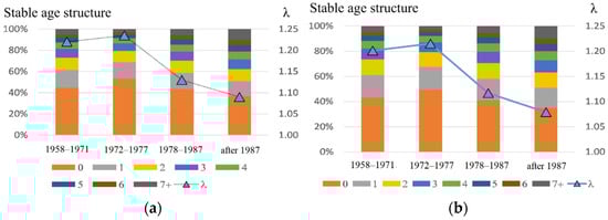 Stable age structure of the male part of the northern fur seal population (left axis) and annual growth rate of the population (on the right axis), corresponding to the periods: 1958–1971, 1972–1977, 1978–1987, and after 1987; here, (a) corresponds to the parameter estimates obtained by the iteration and (b) refers to the fitting method.