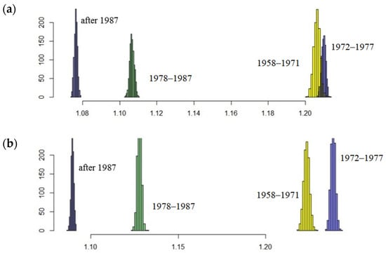 Expected rate of population growth λe distributions in random samples (1000 iterations) for each period; here, (a) corresponds to parameter estimates obtained by the iteration and (b) refers to the fitting method.