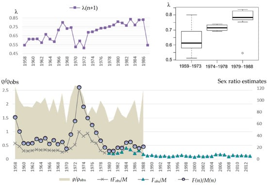 (bottom) Dynamics of actual sex ratio ρ = F(n)/M(n) for the period 1958–1988, visual sex ratio ρobs = Fobs(n)/M(n) for 1980–2013, supplemented by calculated ones tFobs(n)/M(n) for 1958–1979 based on Equation (5) (on the right axis); and ρ/ρobs (on the left axis). (top) Dynamics of pregnant females’ proportion in the next year λ(n + 1) (on the left), and a box plot of λ(n + 1) for the periods corresponding to different reproductive efficiency of bulls (on the right).