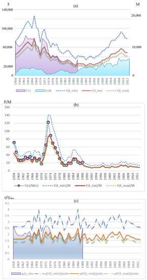 (a) Dynamics of the upper F(λmin), median F(λme) and lower F(λmax) estimates of the total number of mature females in the population for each observation year, Equation (3); dynamics of females’ number estimates from marine samples F(n) for 1958–1988 (on the left axis), and the number of bulls at the rookery M(n) (on the right axis). (b) Dynamics of sex ratio F(n)/M(n) according to observations for the period 1958–1988 and sex ratios corresponding to the upper, median, and lower estimates of the females’ number for the entire period. (c) The difference dynamics between calculated sex ratios and that observed at the rookery.