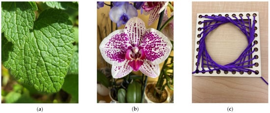 Participants’ photos: (a) James—Mint leaf, Voronoi pattern; (b) Chloe—Orchid petals, Fibonacci sequence (one lip, three inner petals, and five outside petals); (c) Mia—String art, circular pattern with two parabolas (conic section or two quadratic functions).
