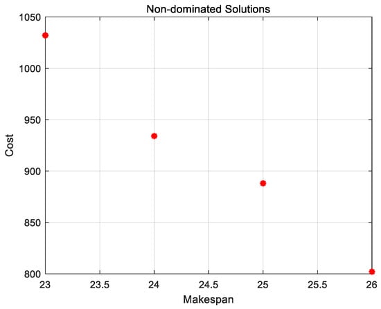 According to the critical path method, the shortest makespan of the project is 23. Considering the unavailability of resources, we assume that the deadline of the project is 26 (any number greater than 23 is allowed) (that is, ). According to the GA-PR algorithm, the optimized scheduling scheme can be obtained, as shown in Figure 3 and Table 3. Taking scheme 1 as an example, the detailed project scheduling is shown in Figure 4 and the detailed resource scheduling is shown in Table 4.
