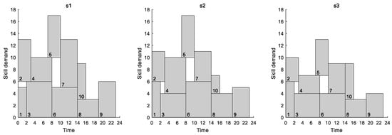 The set of activities that are executed at moment is , generated based on activity scheduling, which is the outer layer’s solution. Calculate the total demand of each type of skill at moment , and calculate the total initial supply of each type of skill at moment according to the resources’ initial skills and their available state. The gap between and is defined as skill-demand tension . The smaller the gap, the smaller the demand tension of . We rank these skills according to the demand tension in ascending order, and the external skill order at moment is .