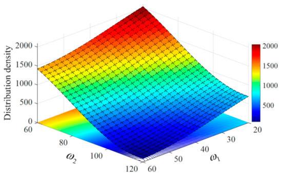 Assuming that the warhead adopts the same shell material and equivalent explosive charge, the dispersion ranges ω1 and ω2 of the warhead fragments are (20°, 60°) and (60°, 120°), respectively. The dynamic dispersion density distribution of the warhead fragments in the warhead fragment field formed by the explosion of a large-diameter warhead is given in combination with (3), and its trend is shown in Figure 2.