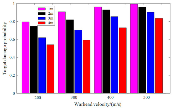 Due to the influence of warhead explosion height and flight velocity on the target damage probability, assuming a stationary target, the target damage probabilities under different conditions, such as warhead explosion heights of 1 m, 2 m, 3 m, and 4 m and warhead flight velocities of 200 m/s, 300 m/s, 400 m/s, and 500 m/s, are calculated and shown in Figure 6.