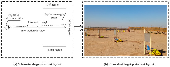 Due to the limited actual test conditions, all warheads used to damage the simulated target by the static explosion are of identical types. The damaging effect of the warhead fragments in the warhead fragment field after the warhead explosion is analyzed. In the static explosion test, a few equivalent targets with rectangular steel plates are used to simulate the damaged target and are arranged in a U shape. The test layout scene is shown in Figure 7a. The equivalent target plate in the center of the U-shaped region simulates the central area of the target, which is called the middle region. The equivalent target plates arranged on both sides of the U-shaped region are the other areas of the target, which are the left and right regions. In the test, the equivalent target plate is arranged first, and subsequently, the projectile is placed at a certain distance from the center of the middle area. Before the projectile explodes, the vertical distance between the projectile and the middle area of equivalent target plate is measured. Subsequently, the intersection angle between the warhead and the middle area is calculated, which is the intersection angle between the projectile and the target. Figure 7b shows the layout of the equivalent target plate prior to the warhead explosion.