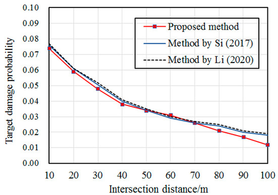 In their paper, Li et al. [11] established a target damage efficiency assessment calculation model according to the damaged area of and the damage characteristics of the target. Si et al. [19] studied the method of assessing the damage caused by the fragmentation warhead against airplane targets; the function to calculate the number of warhead fragment impacting the targets was provided under the condition of random intersection of missiles and targets, and they deduced the damage probability. This paper establishes the calculation function of the number of effective warhead fragments hitting the target, introduces the profit-loss value of warhead fragment group after the warhead explosion as based on these two factors, and derives the target damage assessment mathematical model under the condition of random intersection of the projectile and the target. Assuming that the intersection angle of the projectile and the target is 2°, the target damage probability under different intersection distances is calculated by using the proposed method in this paper and the methods of references [11,19], as shown in Figure 8.