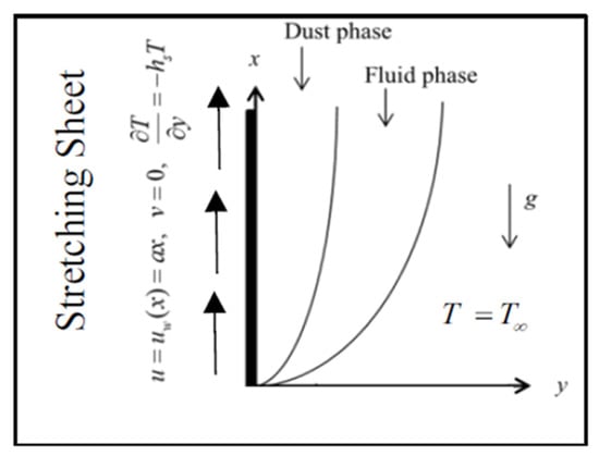 Flow suspended with particles affected by TDV over a vertical stretching sheet was introduced for the steady incompressible mixed convection of non-Newtonian Eyring fluid under NH condition. The term, , is related to temperature of ambient fluid. The -axis was oriented to the vertical plane, and the -axis to the plane was perpendicular. The sheet is stretched with the velocity, where, is stretching rate. The flow was created by the stretching of the sheet due to the simultaneous application of two equal and opposite forces along the -axis, holding the origin fixed and finding the flow to be limited to the area, . The configuration of a physical model is displayed in Figure 1.