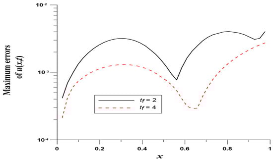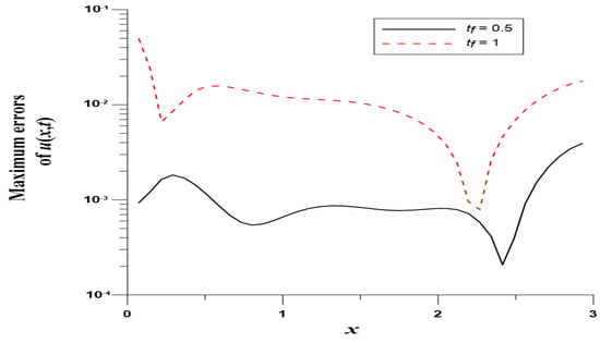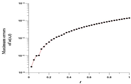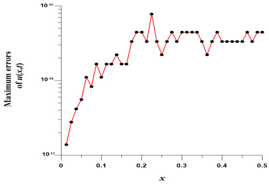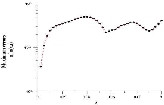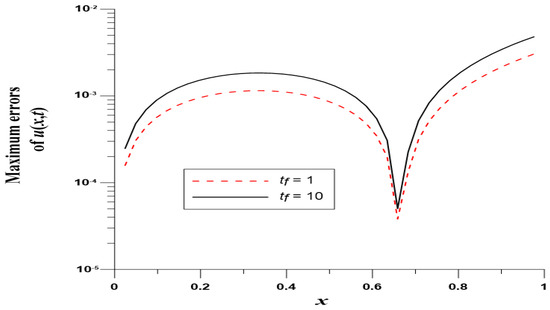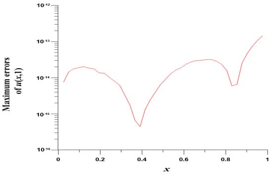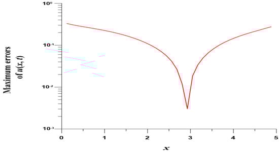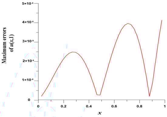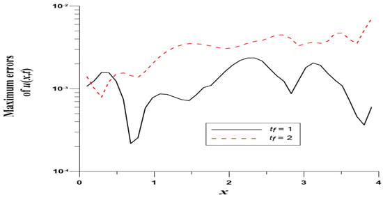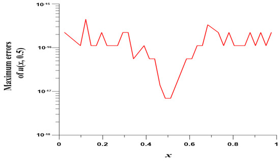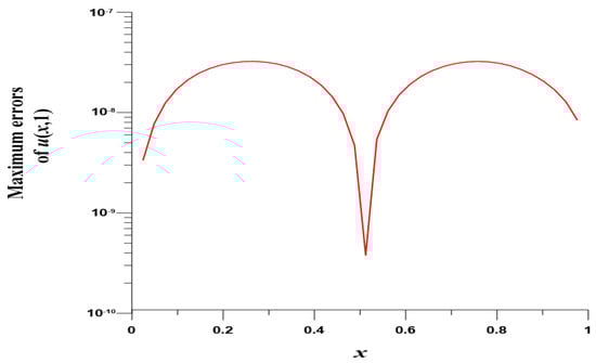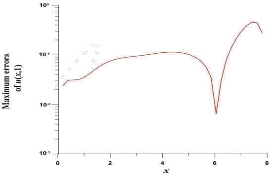 We take , , , and . In this case, we use the Gaussian elimination to solve the linear system. Figure 8 displays the MEs of versus , which are highly accurate with ME and are much more accurate than [8]. Figure 9 displays ME(u) with respect to at .