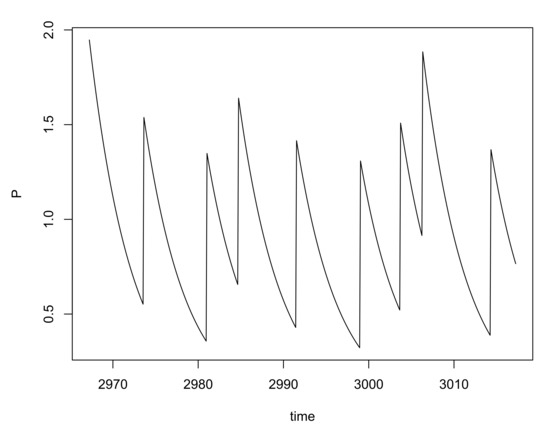 It is well known, that a critical pathogen load is required for an infection to occur [26,38]. For a sub-critical level, the innate immune system is able to control the pathogens. We take that into account by defining a clearance rate for the within-host pathogens. That is, within a single susceptible individual, we have an interplay between the booster event and the degradation of pathogens, which establishes a stochastic process (see Figure 1). Experiments on mice with a moderate pathogen level show the exact kind of decline in the pathogen load addressed by this sub-model for the susceptible [30]. Furthermore, the infection rate is a function depending on the pathogen load, . Here, if the pathogen load is sub-critical. only becomes positive if the pathogen load P exceeds some value and persons with such a high pathogen load are transferred into the infected class. An infected individual sheds pathogens at rate into the environment, and recovers at a rate of . We assume that the recovered individuals become immune and stay immune: the time scale of our model covers months (time scale of one cholera epidemic), and not years, where recovered individuals become susceptible again.